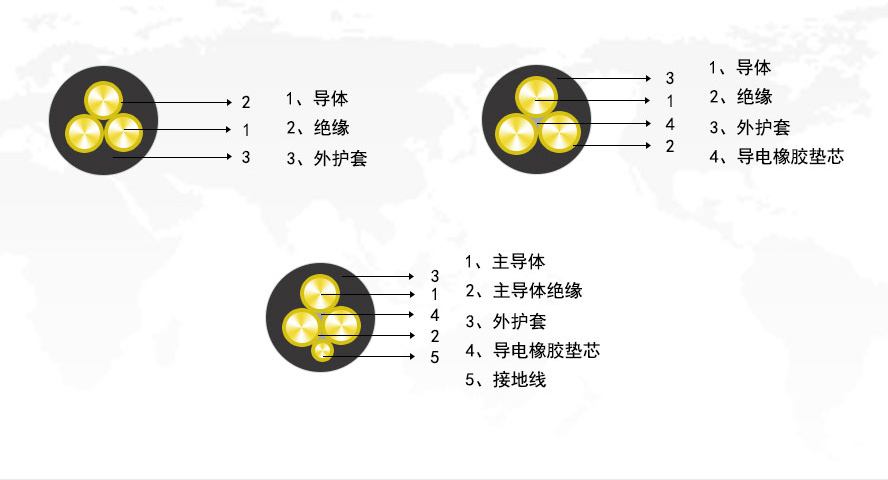 其結(jié)構(gòu)由內(nèi)至外分別為:1、導(dǎo)體2、絕緣3、填充4、包帶5、外護套
